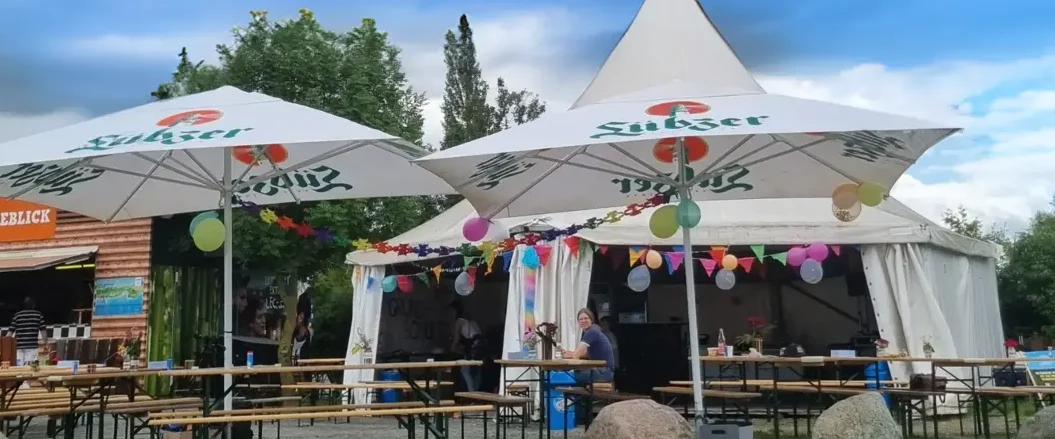 Ein elegantes Pagoden-Festzelt sorgt für zuverlässigen Wetterschutz und schafft eine stilvolle Atmosphäre – ganz gleich ob bei Sonne oder Regen. Die angrenzende Freifläche eignet sich hervorragend für Barbecues, Lagerfeuer oder als Treffpunkt für Ihre Gäste unter freiem Himmel.